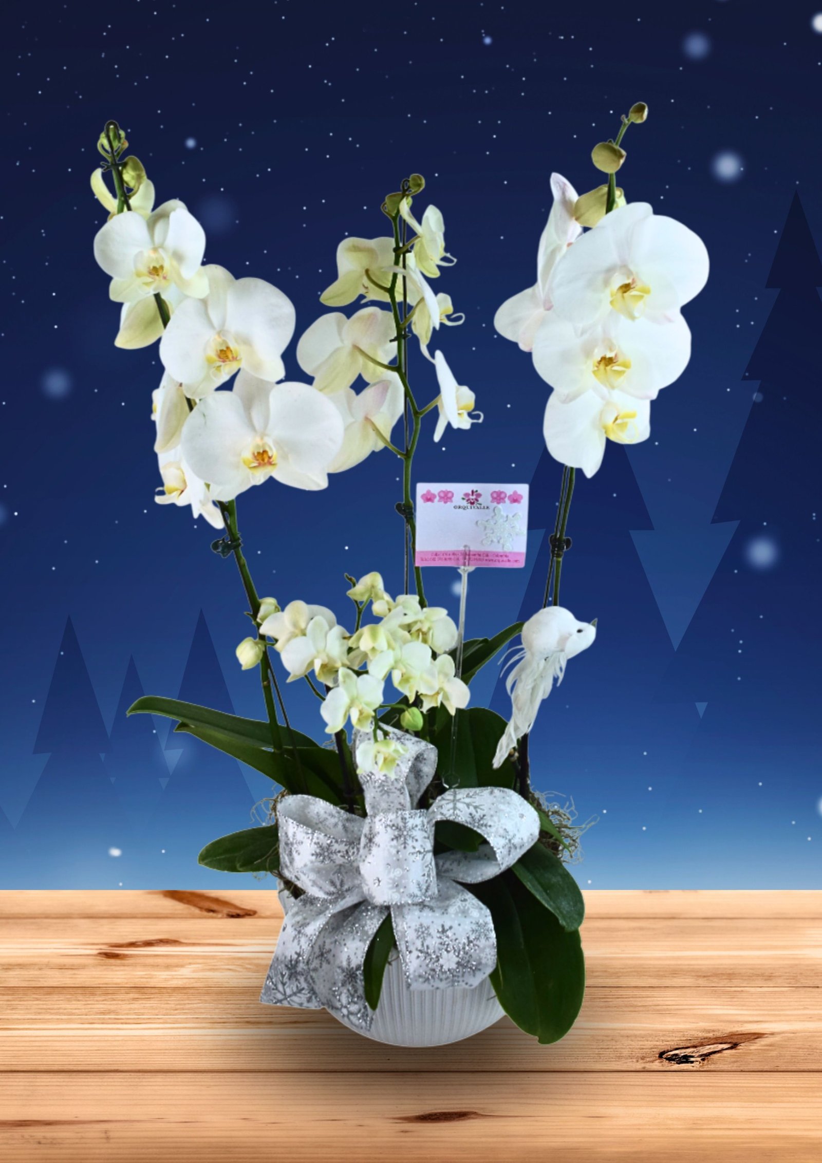 Hermosas y exclusivas Phalaenopsis blancas, vienen una planta de una vara, una de dos varas y una multiflora en base sintética, con accesorios decorativos y tarjeta con dedicatoria.